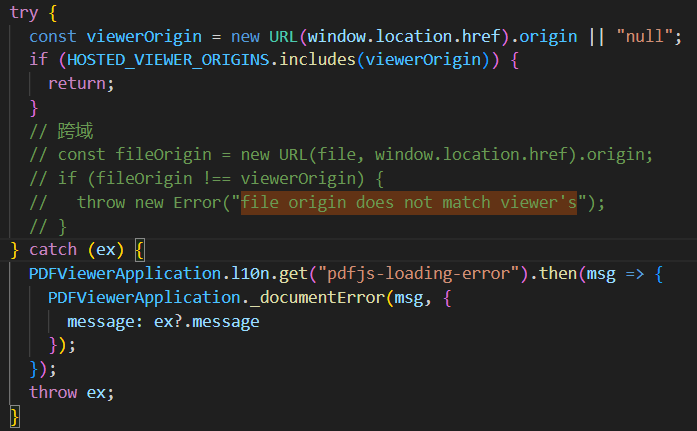 打开web->viewer.mjs(或viewer.js)文件,搜索"file origin does not match viewer's”找到下面代码所在的位置,然后注释掉就可以实现跨域访问了