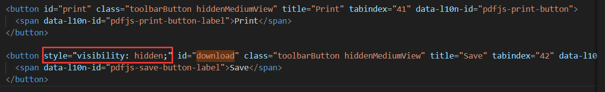 禁用下载、打印等功能:不能直接注释会报错,一般建议采用css方式隐藏。例如注释下载功能:打开web->viewer.html文件,搜索关键字“download”,在相关代码段加上style="visibility: hidden;"即可